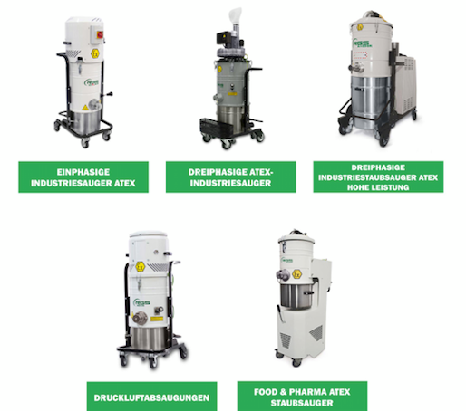 Alle Staubsauger sind für die Kategorie 3 zertifiziert, also in den Zonen 2-22 einsetzbar und einige Modelle sind für die Kategorie "2" geeignet, also Zone 1-21. Für Anwendungen in Zone 0-20 empfehlen wir den Einsatz von Maschinen in Druckluftausführung.