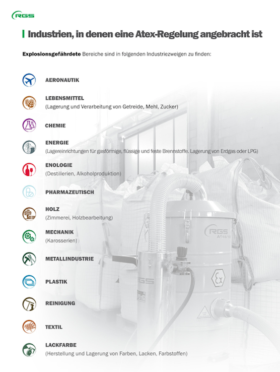 Die Baureihe der Atex-Sauger kann in Bereichen eingesetzt werden, in denen aufgrund des Vorhandenseins von explosiven Stäuben oder Gasen Explosionsgefahr besteht. Es gibt Maschinen, die speziell für Bereiche mit Staub, mit dem Suffix "D" oder für Bereiche mit Gas und Staub, mit dem Suffix "GD" ausgelegt sind.